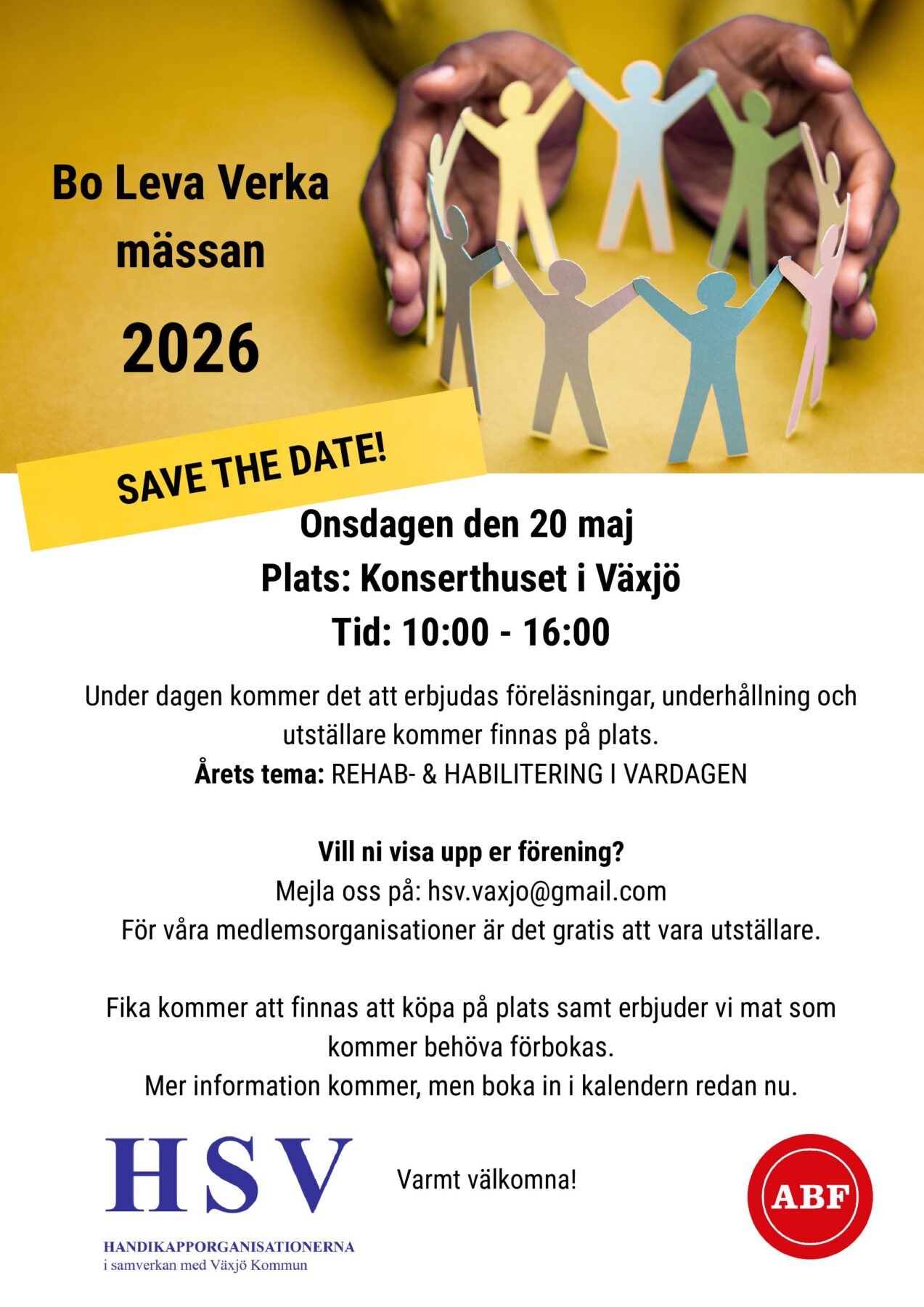 - Onsdag 20 maj- Bo-Leva-Verka-Mässa i Konserthuset Växjö kl.10-16. Arrangeras av HSV och Växjö kommun